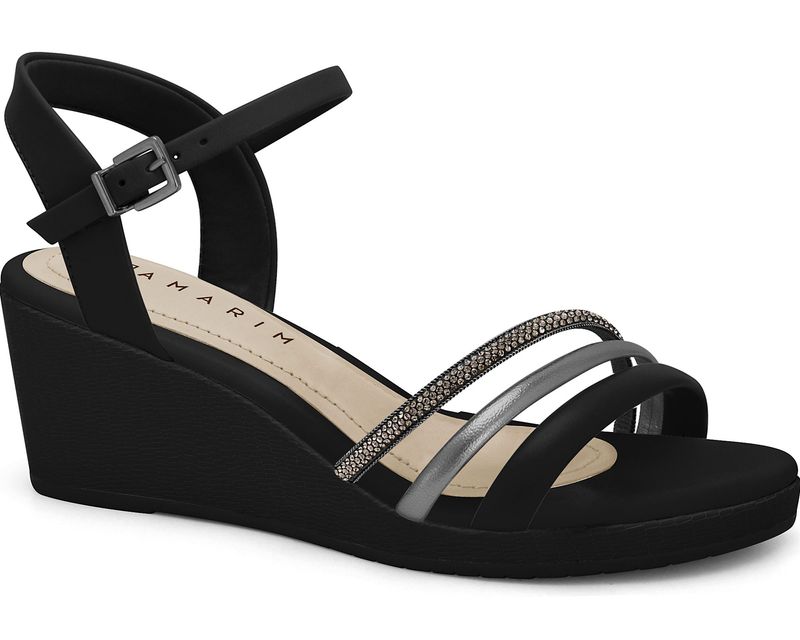 Eleve seu visual com a sandália anabela preta com tiras delicadas e detalhes em grafite. Ideal para mulheres que buscam unir conforto e elegância, essa sandália traz um toque sofisticado e moderno para qualquer look. Com um salto anabela de altura média, proporciona estabilidade e conforto durante todo o dia, sem abrir mão do charme.